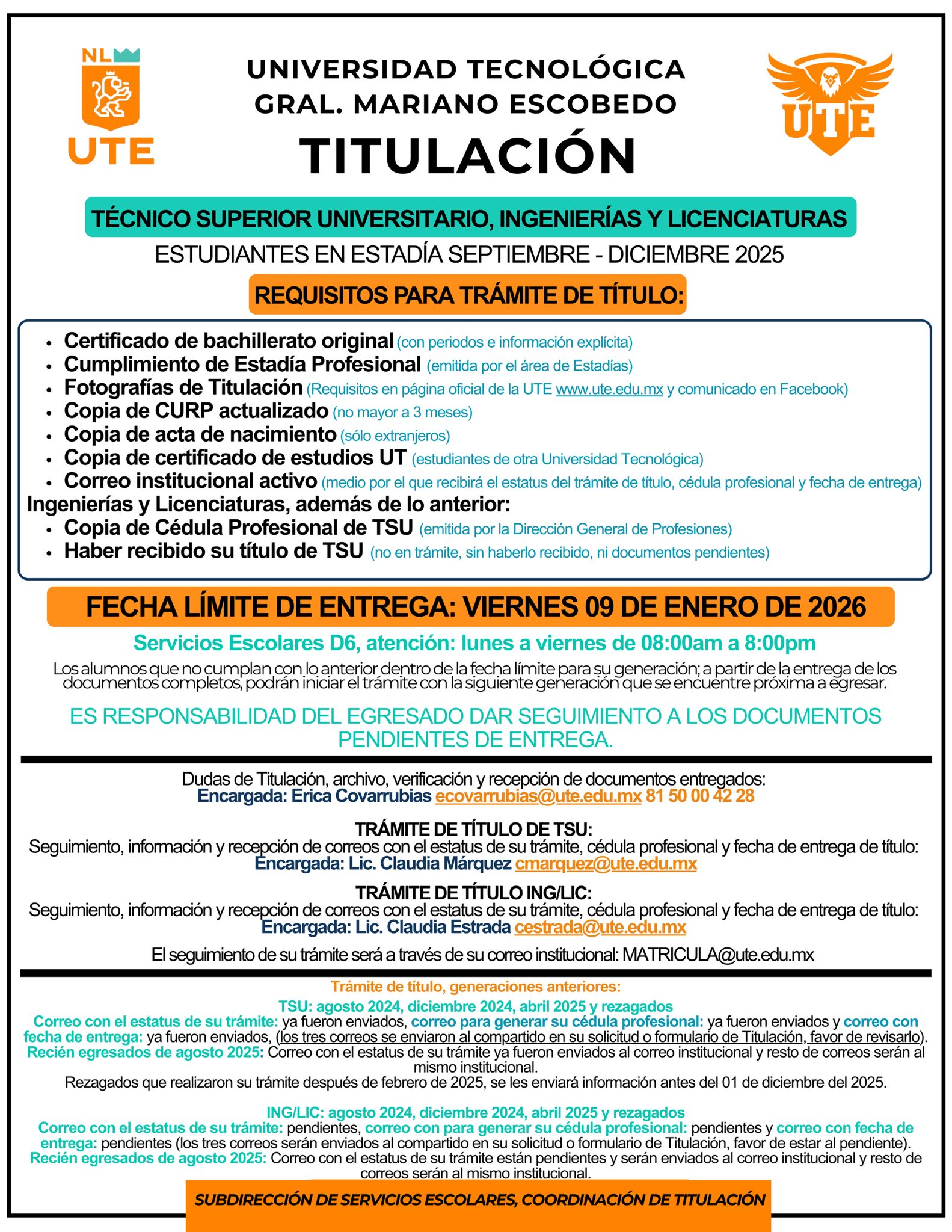 La Universidad Tecnológica Gral. Mariano Escobedo, es un Organismo Público Descentralizado del Estado de Nuevo León, que contribuye a consolidar los programas de desarrollo de la educación superior tecnológica en la entidad, y que forma parte del sistema nacional de Universidades Tecnológicas.