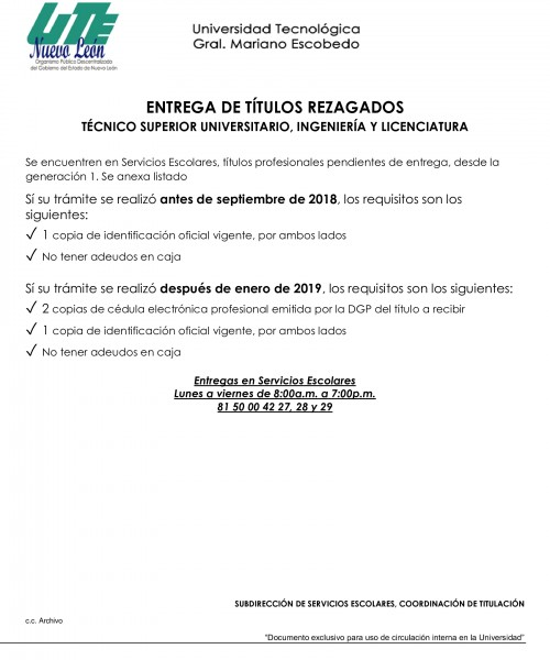 Entrega de Títulos Rezagados ASPIRANTES Inscripciones Modelo Educativo Estadías Horarios Carreras ENLACES AULANET Sistema de Gestión de Calidad Calendario Académico Reglamento Académico TITULACIÓN Titulación Entrega de Títulos Rezagados Resultados de Procesos de Evaluación Licitación Pública No. UTE – LPN001/2025 Contraloría Social del Programa U006 «Subsidios Federales para Organismos Descentralizados Estatales», 2025 Relación de Títulos Rezagados TSU Relación de Títulos Rezagados LIC/ING